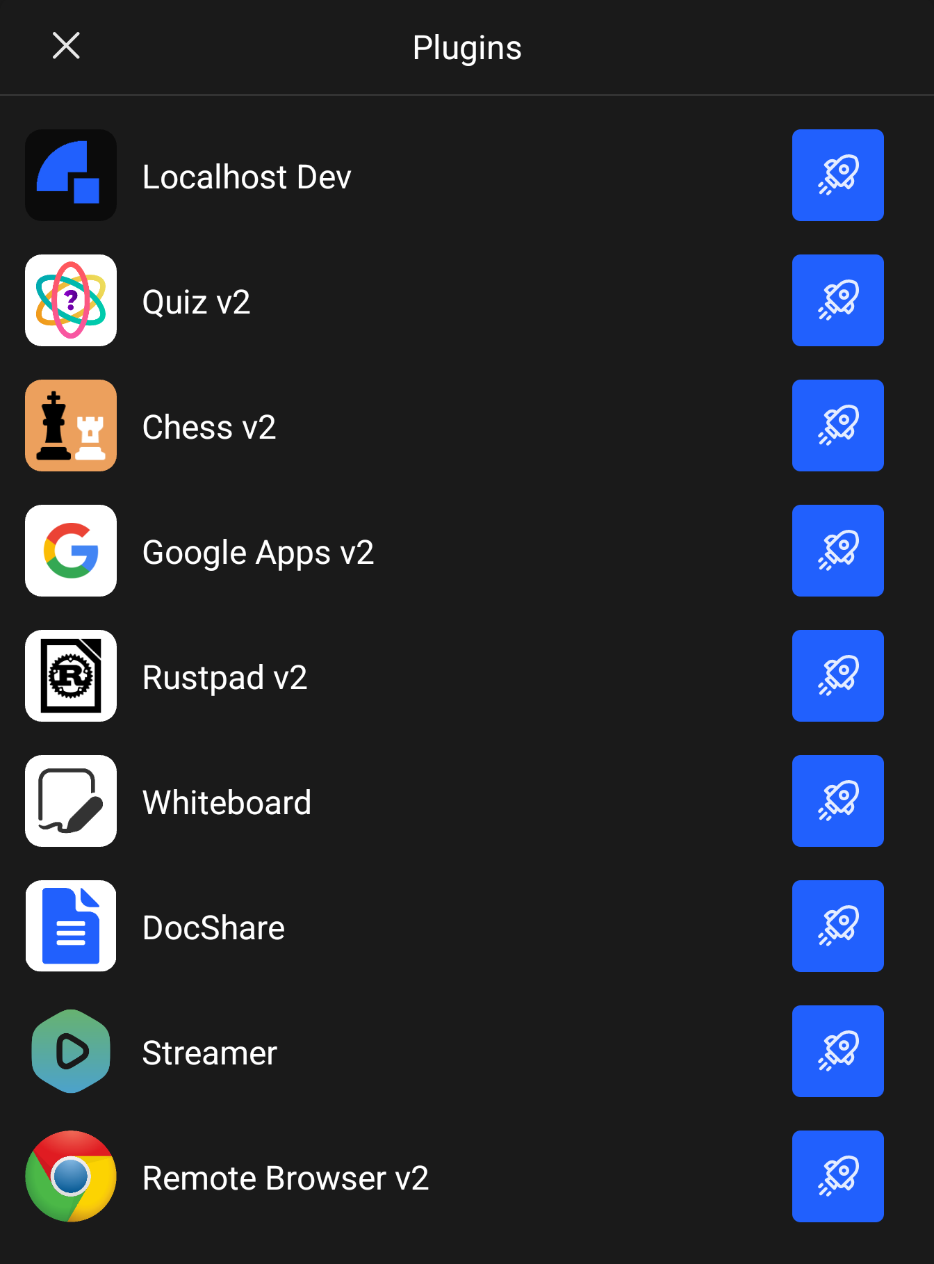 To use a plugin in a meeting, you can use the rocket icon next to the plugin name in the plugins list.